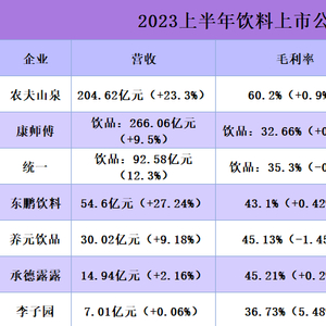 财报数据显示,2023年上半年农夫山泉、康师傅、统一、东鹏饮料、养元饮品、承德露露、李子园等饮料公司总体都实现了营收和净利润上涨,而农夫山泉以60.2%的高毛利率遥遥领先,净利润超其他几家之和。