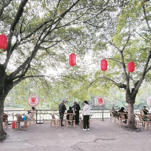 我在河边的梧桐树、小叶榕树下的竹椅上坐下,点了一杯素毛峰。