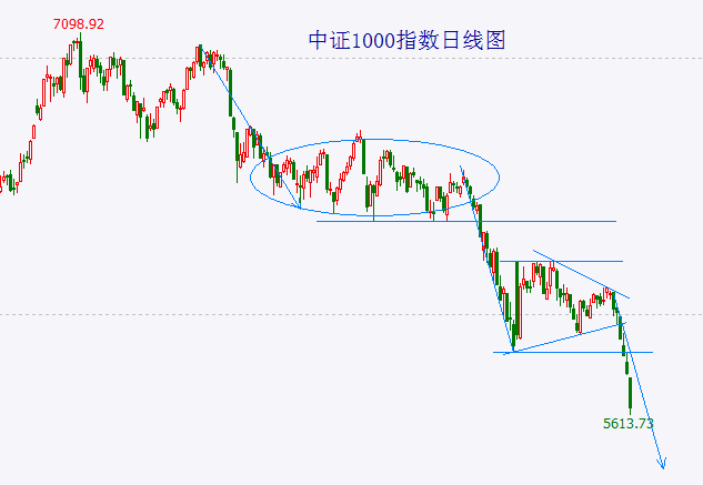 大盘加速下跌,从中证1000指数来看,跌破三角形下轨后出现直线下挫,这是完全符合预期的,是非常标准的走势。下跌肯定是远没有到位的,只不过加速后可能随时暂时探底回升止跌。汇金再次出手买入ETF,但这早有预期、影响有限,下跌趋势中仍应继续观望为主。