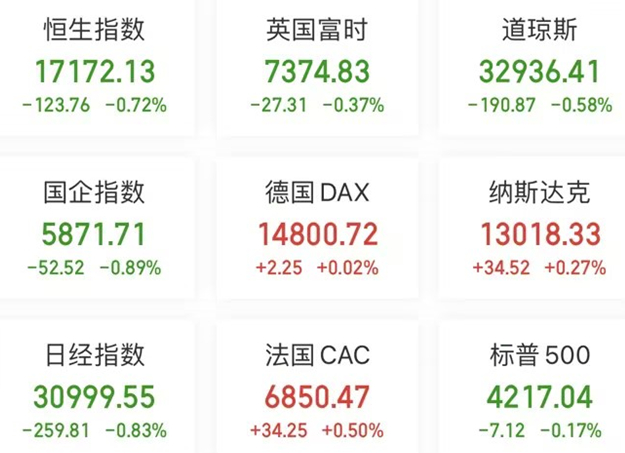 美国10年期国债收益率上升9个基点,至5.00%,为2007年以来最高。随着一些美联储官员面对强于预期的美国数据而表现出鹰派立场,收益率本月已上升逾40个基点。评:10年期美债作为“全球资产定价之锚”,16年后再次回到5%以上,全球的风险资产压力山大。
