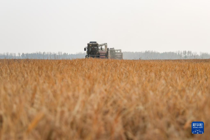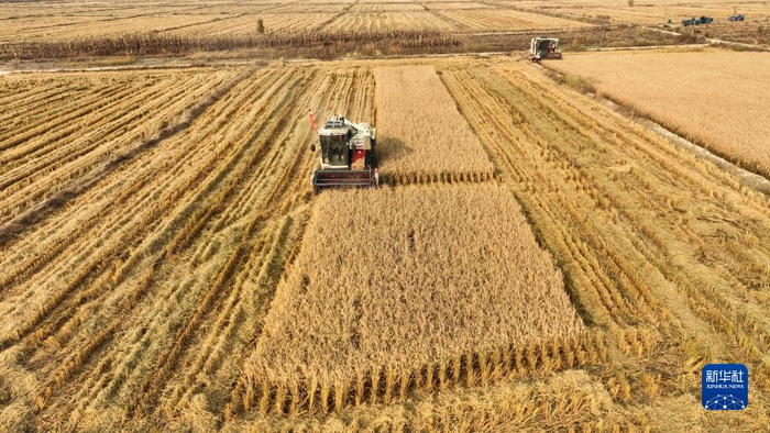10月23日,水稻收割机在彰武县大冷镇上三家子村的稻田中收割水稻。金秋时节,辽宁省阜新市彰武县大冷镇上三家子村的稻田里机声隆隆,一片丰收的繁忙景象。彰武县地处科尔沁沙地南缘。近年来,彰武县积极探索荒漠化治理新路径,通过河流综合治理、“水田湿地”工程建设等方式遏制土壤沙化,扩充湿地面积,补充地下水位,提升耕地质量,实现生态、经济效益的有机统一。新华社记者 龙雷 摄