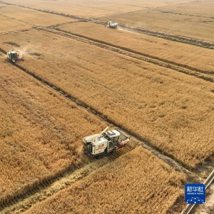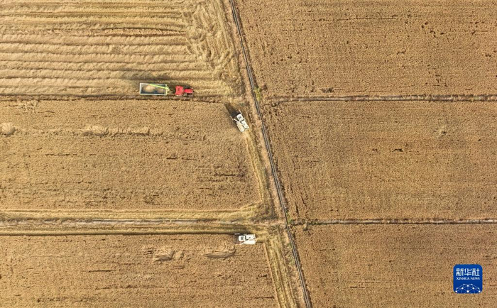 10月23日,水稻收割机在彰武县大冷镇上三家子村的稻田中将水稻装车(无人机照片)。金秋时节,辽宁省阜新市彰武县大冷镇上三家子村的稻田里机声隆隆,一片丰收的繁忙景象。彰武县地处科尔沁沙地南缘。近年来,彰武县积极探索荒漠化治理新路径,通过河流综合治理、“水田湿地”工程建设等方式遏制土壤沙化,扩充湿地面积,补充地下水位,提升耕地质量,实现生态、经济效益的有机统一。新华社记者 龙雷 摄