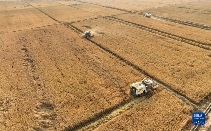 10月23日,水稻收割机在彰武县大冷镇上三家子村的稻田中收割水稻(无人机照片)。金秋时节,辽宁省阜新市彰武县大冷镇上三家子村的稻田里机声隆隆,一片丰收的繁忙景象。彰武县地处科尔沁沙地南缘。近年来,彰武县积极探索荒漠化治理新路径,通过河流综合治理、“水田湿地”工程建设等方式遏制土壤沙化,扩充湿地面积,补充地下水位,提升耕地质量,实现生态、经济效益的有机统一。新华社记者 龙雷 摄