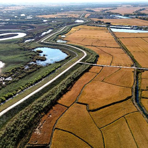 金秋十月,位于黑龙江省东部、松花江下游汤原县的黑鱼泡省级自然保护区内,聚集着成群结队即将南下越冬的鸟类,湿地里的水草也从鲜绿变向暖黄色。隔着一条堤坝,比邻的稻田泛着金灿灿的光,满眼丰收景象。湿地与农田相互映衬,构成一幅和谐共生的美丽画卷。