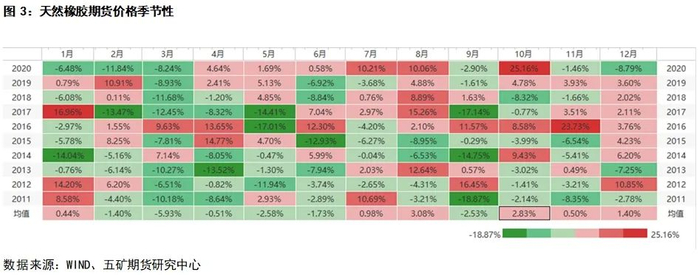 从天然橡胶期货季节性来看,11-12月在2011年到2020年,涨的概率略大。