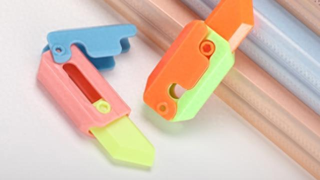 别看“萝卜刀”肉肉墩墩、胖胖乎乎的,刀头也是软塑料制造的,直接伤害力不强,但是,它却是不折不扣地还原了管制刀具——弹簧刀(跳刀)——的结构:可以单手操作弹出“刀刃”,并且锁定“刀刃”,还能发出机械结构碰撞的“啪嗒”声。按照公安部《管制刀具认定标准》,带有自锁装置的弹簧刀(跳刀):刀身展开或弹出后,可被刀柄内的弹簧或卡锁固定自锁的折叠刀具,它属于管制刀具。