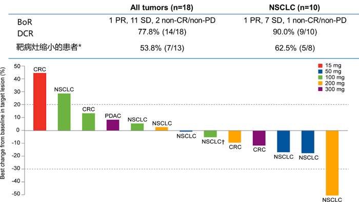2023年8月4日数据截止,共纳入18例患者(肺腺癌n=10,结直肠癌n=5,阑尾粘液腺癌、卵巢癌和胰腺癌各1例)。患者既往接受治疗线数中位数为3线(范围2-7)。未观察到DLTs,未达到MTD。不良反应发生率无剂量依赖趋势。13例患者至少进行了一次基线后评估,1例NSCLC患者接受200mg治疗有部分缓解。18例患者共有11例患者(61.1%)病情稳定,6例(33.3%)靶病灶缩小,包括肺癌和结直肠癌。HRS-4642半衰期约为40小时。