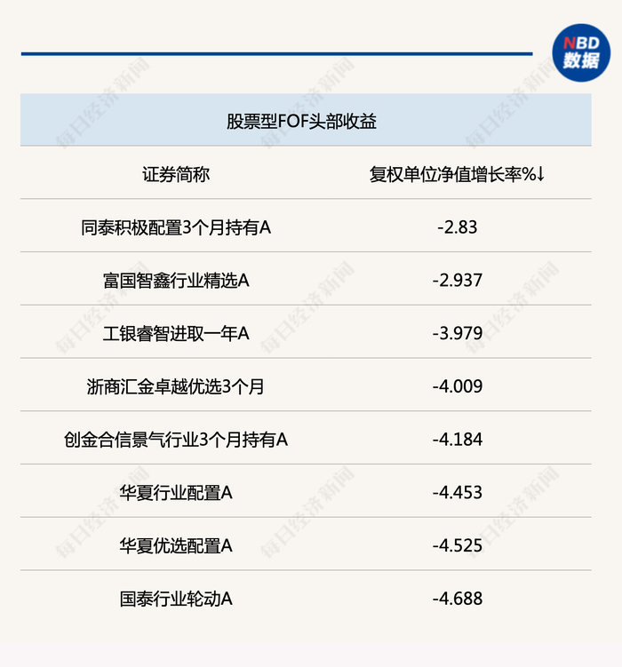 在FOF投资领域,由于此前二季度公募FOF普遍从主动管理型基金向ETF切换,使得过去一周的净值跌幅相对有限。不过每经记者注意到,股票型FOF上周“全军覆没”,就连相对稳健的混合型FOF也在上周普跌,仅有3只微涨。