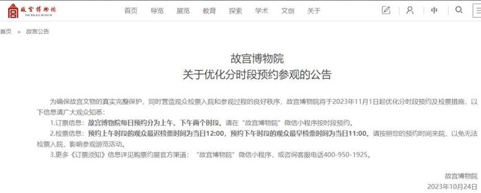 故宫博物院刚刚发布公告,从今年11月1日起,也就是参观接待淡季开始,进一步优化分时段预约的措施:上午预约上午进,入院截止时间为中午12时;下午票入院时间从11时开始。
