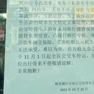 网传“敬告”显示:因从 2020年起,城市公交运营补贴断崖式取消,因多种原因,公交车客流惨淡,亏损运营,在万般无奈之下于11月1日起全区公交车停运。为了确保鲅鱼圈民生公益的城市公交稳定正常运营,该区公交经营车主四年来向银行借贷及民间借贷负债经营,出现巨额亏损,现在又面临车辆交保险、更换轮胎及司机工资发放,难以为继。落款为:鲅鱼圈区全体公交经营车主。