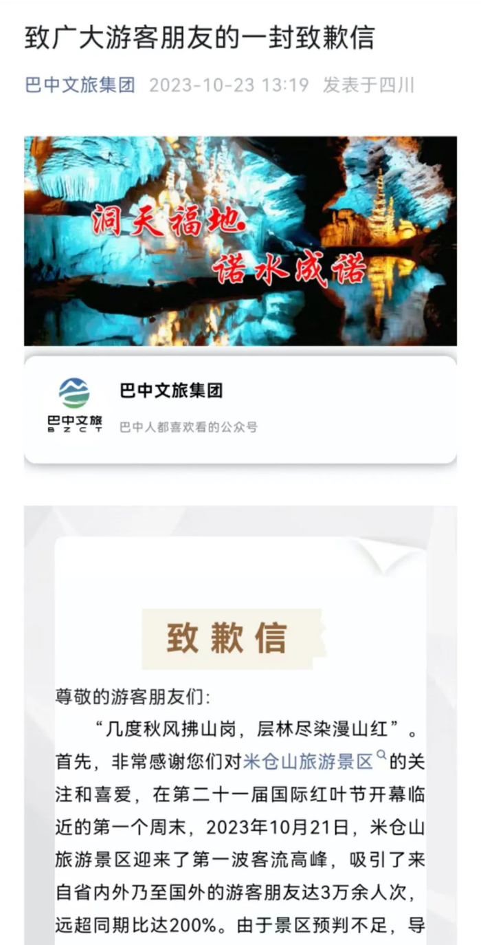 对此,景区昨天(23日)发布道歉信称,10月21日,米仓山旅游景区迎来了第一波客流高峰,吸引了来自省内外乃至国外的游客朋友达3万余人次,远超同期比达200%。由于景区预判不足,导致运力保障不够充分,造成部分游客朋友候车时间较长。截至当晚8点,全部游客被安全运送出景区,未出现游客被困受伤情况。