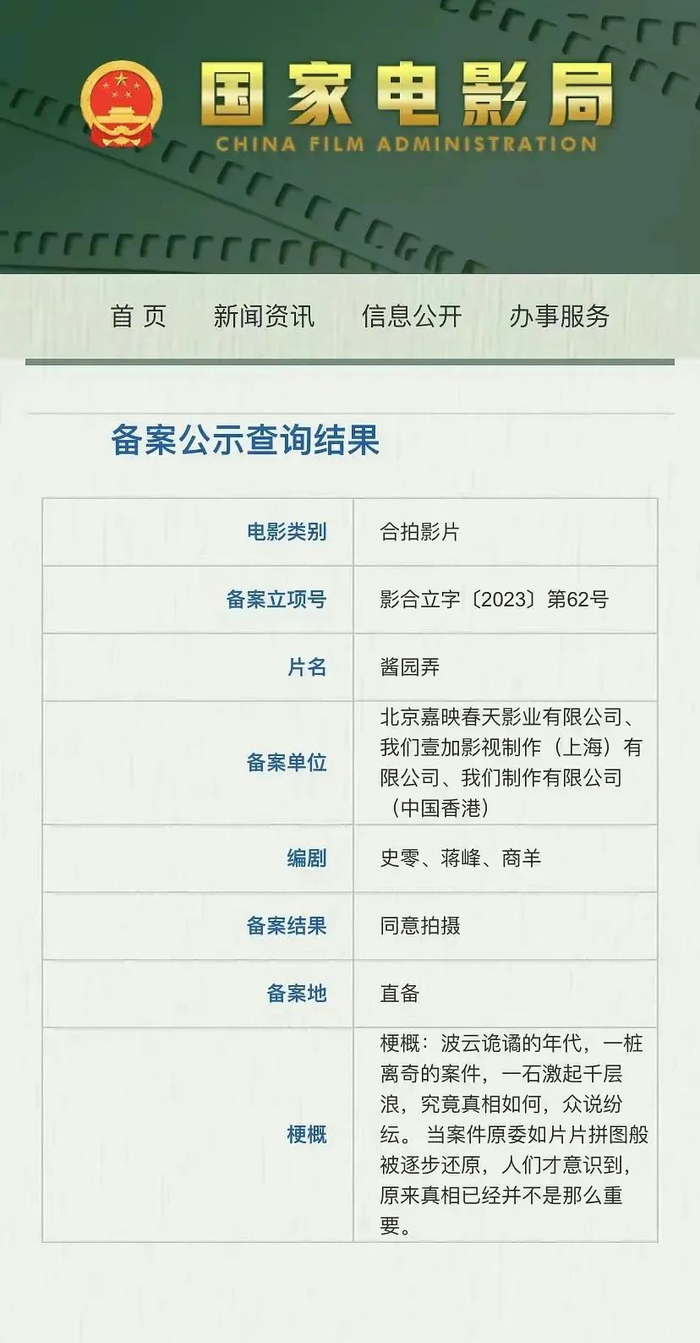 网友提到的《酱园弄》是陈可辛导演正在筹备的新片。