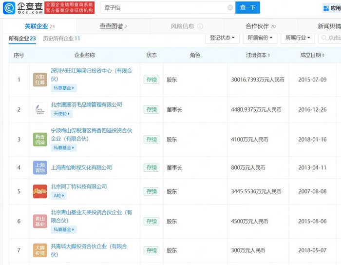 第三方平台企查查显示,章子怡共有23家关联企业,其中担任法定代表人的有5家,包括北京章子怡影视文化工作室、章子怡(上海)影视文化工作室、上海怡宜影视文化工作室等,5家公司皆与影视有关。