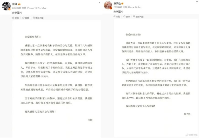 10月23日,结婚8年的章子怡、汪峰双双发布微博,宣布解除婚姻关系。双方均表示:未来将共同抚养、陪伴孩子们长大。
