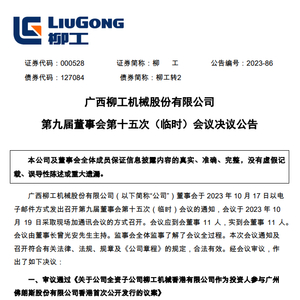 公告显示,广西柳工机械股份有限公司董事会2023年10月19日召开第九届董事会第十五次