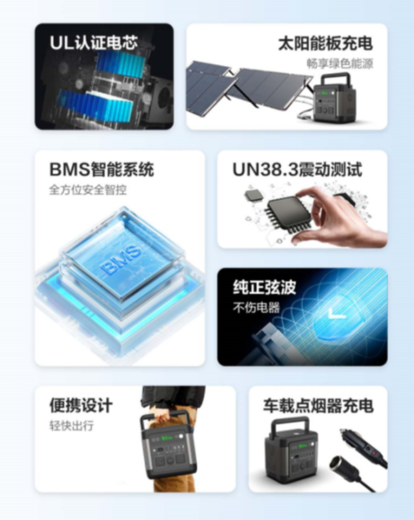 户外电源的使用安全是消费者最关心的问题,一个更有安全保障的电芯是户外电源的灵魂所在。骆驼户外电源选用三元锂和磷酸铁锂电芯,两款电芯均达到车规级,更有安全保障。此外,V-0级阻燃外壳,可增强产品的耐磨抗震性能;BMS电池管理系统实时监控,可控制充放电、保障电源安全、延长使用寿命。三项技术为骆驼户外电源的安全性能筑起了坚实的防线。