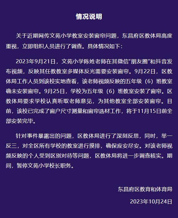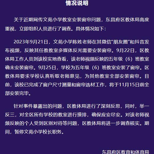 2023年9月21日,文苑小学陈姓老师在其微信“朋友圈”和抖音发布视频,反映其任教教室多媒体反光需要安装窗帘。9月22日,区教体局工作人员到该校实地查看,该老师视频反映的五年级(6)班教室确未安装窗帘。9月25日,学校为五年级(6)班教室安装了窗帘。区教体局要求学校认真听取老师意见,为其他教室全部安装窗帘。目前,该校已完成了窗户尺寸测量和窗帘选材工作,将于11月15日前全部安装完毕。