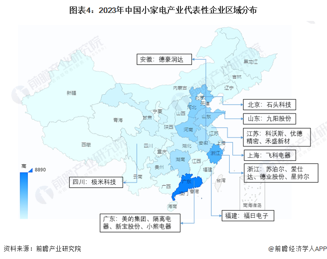 从代表性企业分布情况来看,广东省的代表性企业分布数量最多,有美的集团、格力电器、新宝股份和小熊电器等;浙江省有苏泊尔、爱仕达、德业股份以及星帅尔等;江苏省有科沃斯、优德精密和禾盛新材。