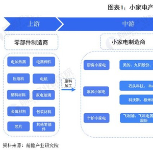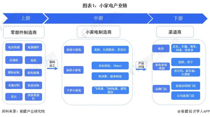 小家电产业链主要分为上游原材料和零部件供应、中游小家电制造和下游小家电销售三大环节。小家电行业上游原材料和零部件包括电加热器、电器阀件、塑料、剥离、金属材料、包装材料等各类零部件供应商,由于各种不同小家电所需原材料零部件不同,因此上游覆盖企业范围较广,品牌也较多元化;中游小家电制造企业包含了国外大企业和国内家电综合制造企业(如美的)、小家电制造企业各类型企业;下游主流销售渠道有综合电商平台(如天猫商城、京东商城等)、线下家电卖场(如苏宁、国美)、大型商超、各级经销商门店、公司直营门店等各类分销渠道。