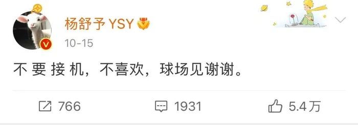 早在10月15日,杨舒予就曾发文拒绝粉丝接机称:“不要接机,不喜欢,球场见谢谢。”