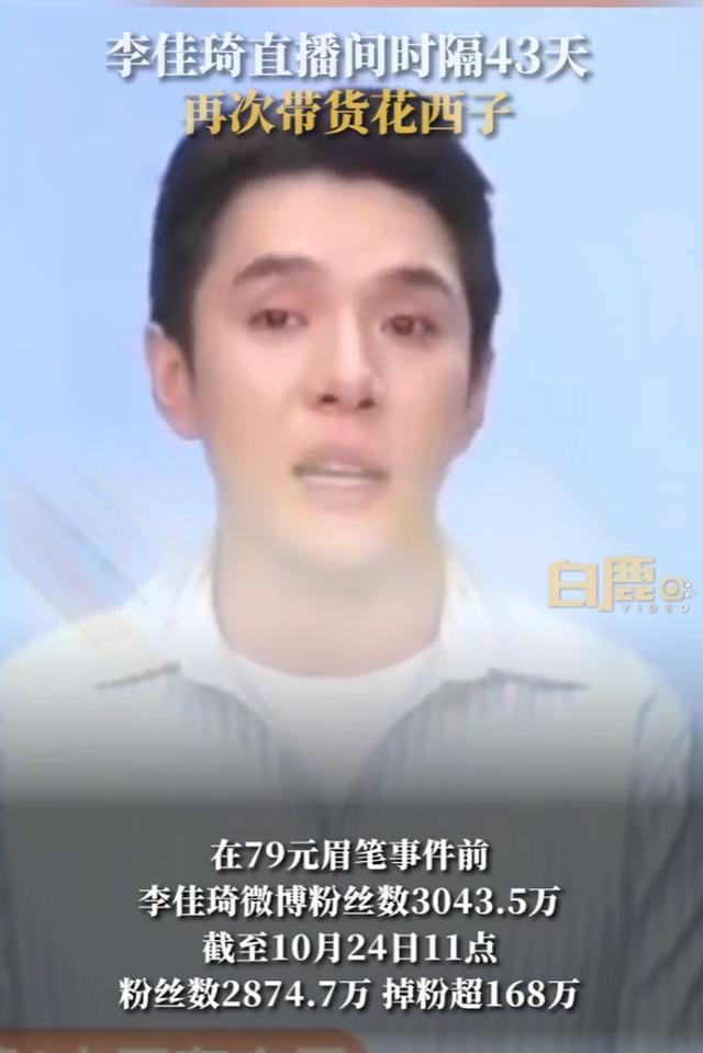 在79元眉笔事件前,李佳琦微博粉丝数3043.5万,截至10月24日11点,粉丝数2874.7万,掉粉超168万。