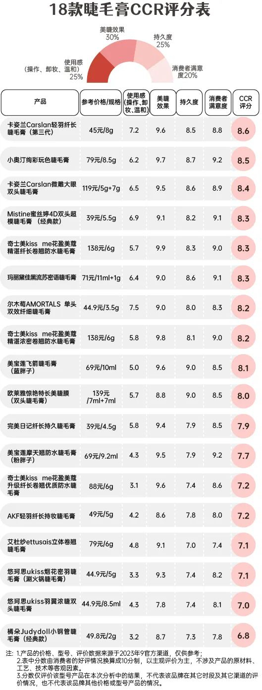 卡姿兰Carslan轻羽纤长睫毛膏(第三代)在本次口碑报告中CCR得分8.6,小奥汀绚彩玩色睫毛膏CCR得分8.5,分别位列口碑排名榜的第一、第二位;橘朵Judydoll小钢管睫毛膏(经典款)得分为6.4分,口碑稍逊,排名居后。