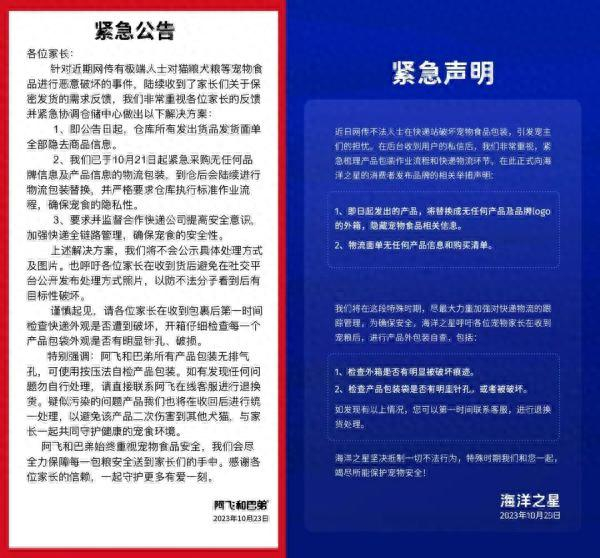 喵偶宠物品牌表示,10月23日起,所有猫粮等软包装产品保密发货;包装箱加装黑色塑料袋,不泄露任何有关宠物的字样;快递面单所有猫粮等产品信息全部用相关数字替换;隐藏所有有关宠物、猫粮、犬粮等字样。
