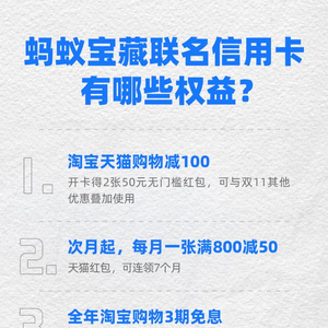这是银行机构首次尝试在支付宝App发行联名信用卡,“电商权益”是蚂蚁宝藏信用卡的最大特色。用户开卡成功后,“双11”期间,可获得两张50元的无门槛淘宝购物红包。比如用户“双11”期间买了一件300元的商品,在享受淘宝消费300元可减50元的红包优惠后,还可以叠加这个红包再减50元,最后只需花费200元即可购买该商品。