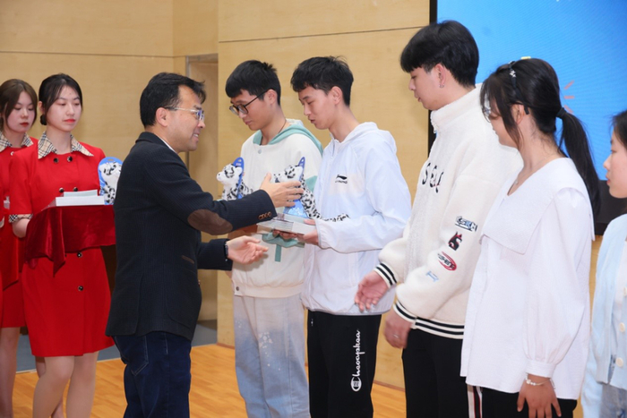 共青团中央青年志愿者行动指导中心党委书记张朝晖为第三期“涓流行动”学生代表颁发赠送“一个长江”项目主题出版物《一个长江——从雪山到海洋》《三江源国家公园自然图鉴》和以雪豹为原型设计的文创产品。