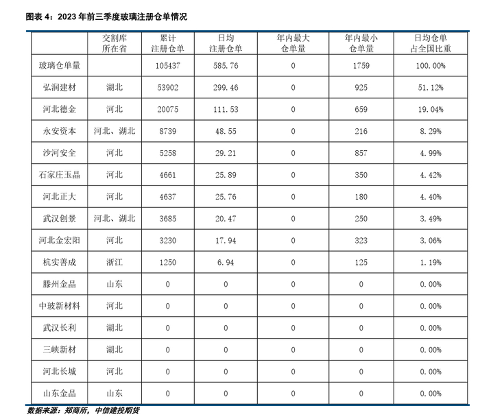 2023年前三季度玻璃累计注册仓单量为105437张,日均仓单为586张(折合1.17万吨现货),日度最大仓单量为1759张,最小仓单量为0张。前三季度注册仓单量最多的交割库为弘润建材,日均仓单量为299张。其余生成过仓单的交割库包括河北德金、永安资本、沙河安全、石家庄玉晶、河北正大、武汉创景、河北金宏阳、杭实善成,日均仓单量分别为111、48、29、26、26、20、18、7张。