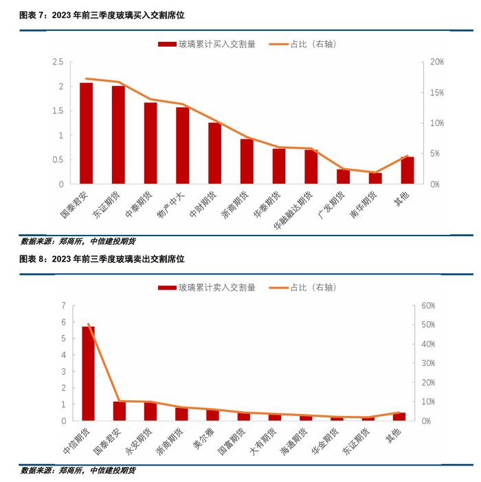 玻璃方面,2023年前三季度累计买入交割玻璃超过1万吨的期货公司席位有5家,分别为国泰君安期货、东证期货、中泰期货、物产中大和中财期货,交割量分别为2.07、2.00、1.67、1.57、1.25万吨。2023年前三季度累计卖出交割玻璃超过2万吨的期货公司席位仅1家,为中信期货,交割量为5.88万吨。由数据可知,玻璃期货交割过程中,卖方席位较为集中,中信期货占比约49%;买方席位分布较为分散,国泰君安期货、东证期货、中泰期货、物产中大和中财期货占比分别约17%、17%、14%、13%、10%。