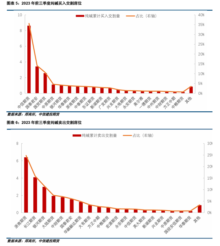 根据郑商所披露的配对信息,2023年前三季度累计买入交割纯碱超过8万吨的期货公司席位仅1家,为中信期货;买入交割纯碱1-8万吨的期货公司席位共4家,包括国泰君安期货、国贸期货、中原期货、银河期货。2023年前三季度累计卖出交割纯碱超过4万吨的席位共有2家,分别为浙商期货的6.40万吨和长江期货的4.10万吨;卖出交割纯碱1-4万吨的期货公司席位共5家,包括银河期货、大陆期货、中财期货、国泰君安期货、华融融达期货。由数据可知,纯碱期货交割过程中,买方席位分布较为集中,中信期货占比近34%,国泰君安期货和国贸期货占比分别为14%、10%;卖方席位相对分散,浙商期货、长江期货、银河期货占比分别约25%、16%、12%。