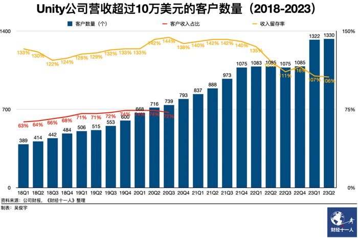 Unity财报显示,截至2023年2月营收超过10万美元的客户数量为1330家。其客户群体相对较为均匀,没有任何一家企业能在其营收中占比超过10%。这是Unity早期靠中小企业和开发者起家带来的健康客户结构。