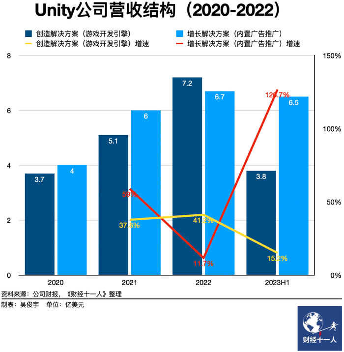 去年四季度开始,Unity营收增速、营业利润大幅提升。尤其是广告收入,2023年上半年增速高达126.7%。