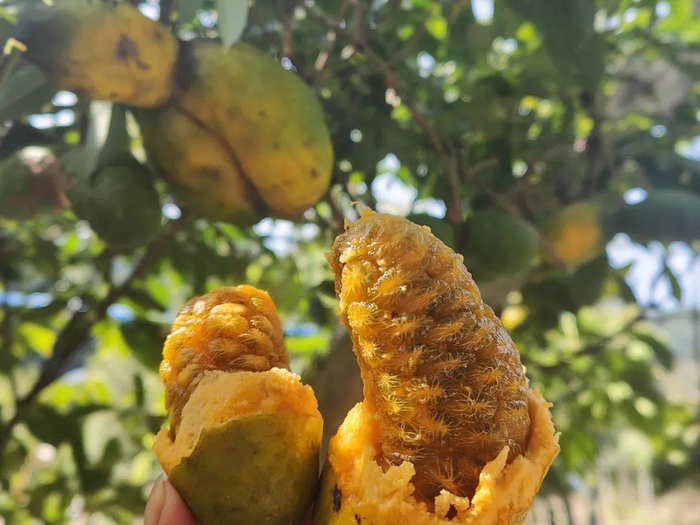 “九月黄”又名羊开口、八月炸、罗藤包等,它的果实皮很厚,果肉呈黄色,晶莹剔透、带花纹的果肉包裹着黑色的籽,吃到口中更是清甜滑嫩,美味可口。“吃了一口感觉好清甜,它的样子长得很漂亮,打开一看果实上布满花纹,好漂亮又好吃!”游客陈小优第一次见识这种水果,迫不及待地摘来品尝。