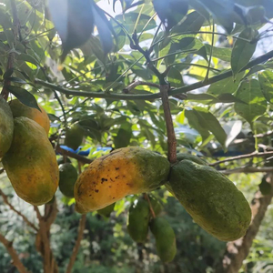 笔者走进该农场,只见一棵棵“九月黄”苗缠着棚架生长着,一个个金黄色的果子吊挂在藤蔓上,果子呈长椭圆形,稍弯曲。有的两个对生,也有三四个对生,眼前一派丰收的景象。