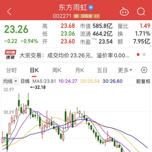 近日,东方雨虹股价持续在走下坡路。截至发稿前报23.26元/股,下跌0.94%,最新市值约586亿元。