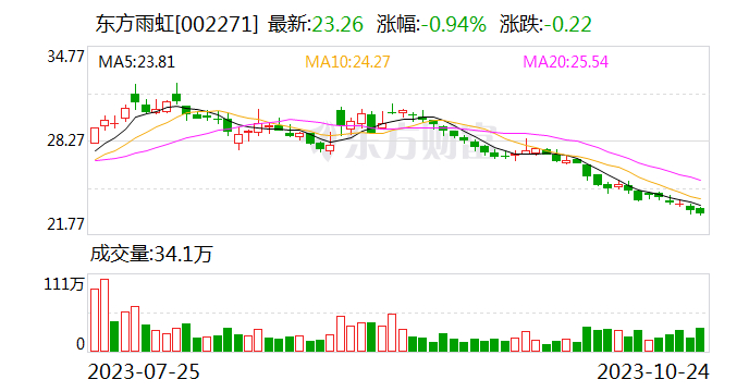 近日,东方雨虹股价持续在走下坡路。截至发稿前报23.26元/股,下跌0.94%,最新市值约586亿元。