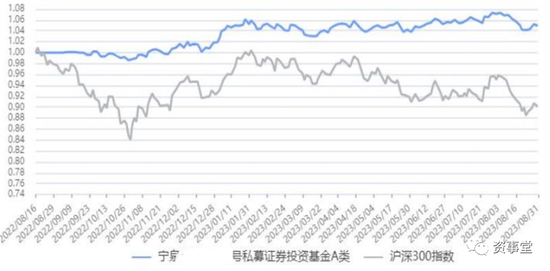 (如上图)宁泉资产曾在2022年8月中旬成立的产品,截止2023年8月31 日,产品净值为1.046,累计涨幅4.60%,表现显著强于沪深300指数。