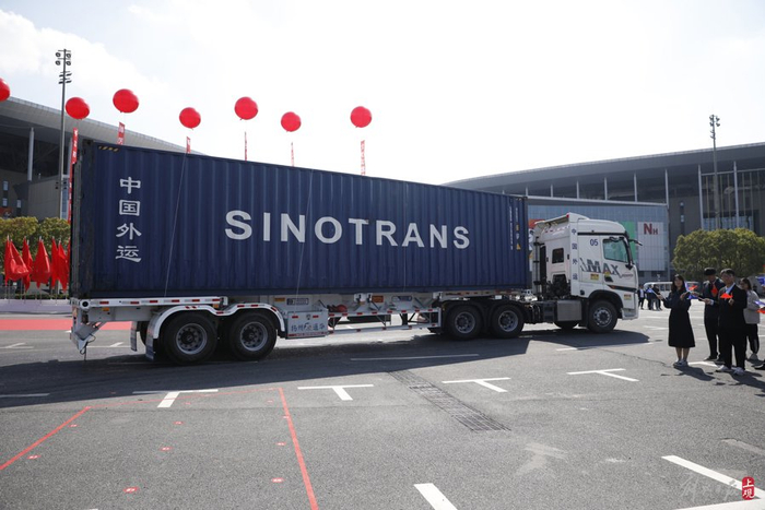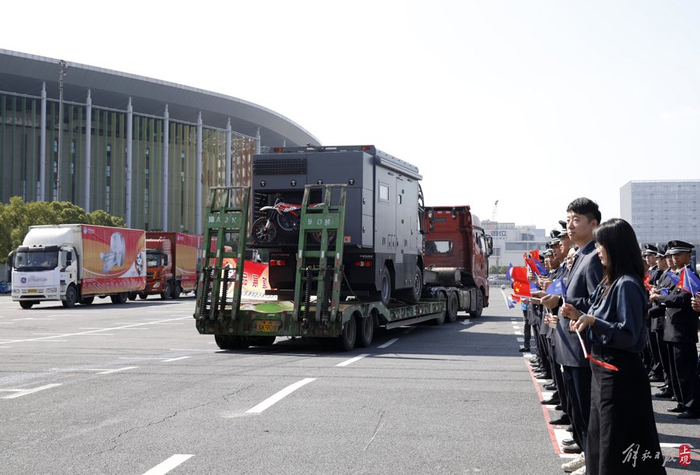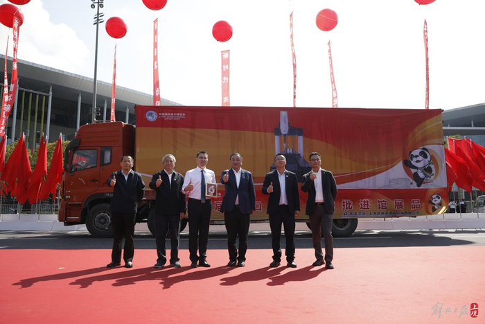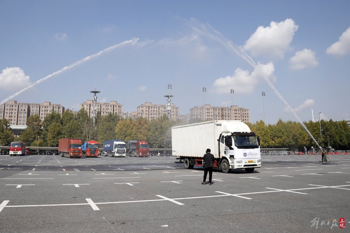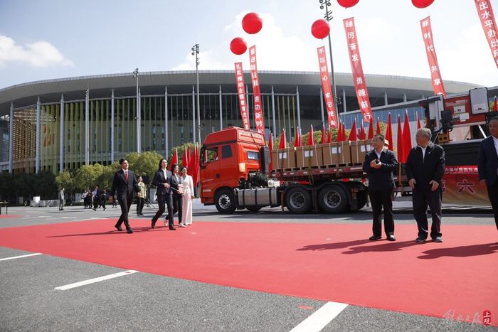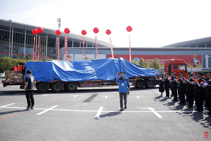 2023年10月24日,五辆卡车载着第六届进博会首批展品抵达国家会展中心(上海)北广场,现场以隆重的水门仪式欢迎新老朋友共襄盛会。