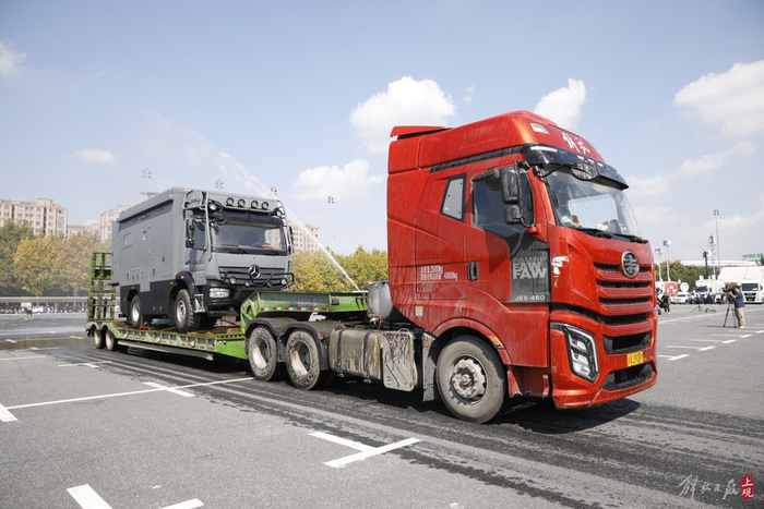 装载西门子医疗的全球首款光子计数CT NAEOTOM Alpha的车辆入场。