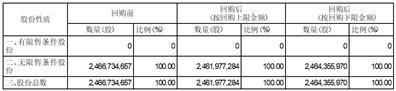 按本次最高回购金额人民币10,000万元、最高回购价格21.02元/股测算,预计回购股份数量约为4,757,373股,约占公司总股本的0.19%。按本次最低回购金额人民币5,000万元、最高回购价格21.02元/股测算,预计回购股份数量约为2,378,687股,约占公司总股本的0.10%。预计回购后公司股本结构变化情况如下: