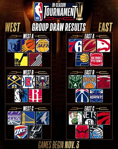 实际上,NBA早就在酝酿增加赛季中期锦标赛的计划,这主要是为了让赛季变得更有竞争性。按照赛程,从今年11月3日开始,NBA全部30支球队将角逐NBA杯(季中赛奖杯被命名为NBA杯),其中只有8支球队能晋级淘汰赛,季中锦标赛半决赛和冠军赛将于12月7日至9日在拉斯维加斯举行。具体规则如下:30支球队将被分为6组,每组5支球队进行小组赛(按照东西部分组)。每支球队将会和组内另外4支球队分别打一场,分为2主场2客场。届时组内排名第一的球队将晋级淘汰赛,而余下共24支球队各分成两组再进行比赛,最终这两组的第一名将持外卡与6支组内第一的队伍组成八强,进行淘汰赛。