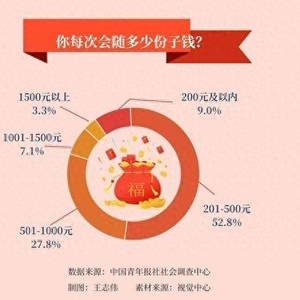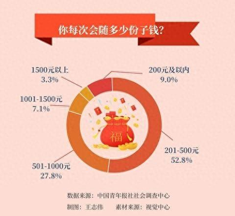 随份子作为一项传统风俗,有表达情感、传递心意的文化内涵。但究竟随多少份子钱合适,却让不少人感到头疼。近日,中国青年报社社会调查中心联合问卷网(wenjuan.com)发布的一项有1000名青年参与的调查显示,95.9%的受访青年随过份子,近四成受访青年单次随的份子钱在500元以上。