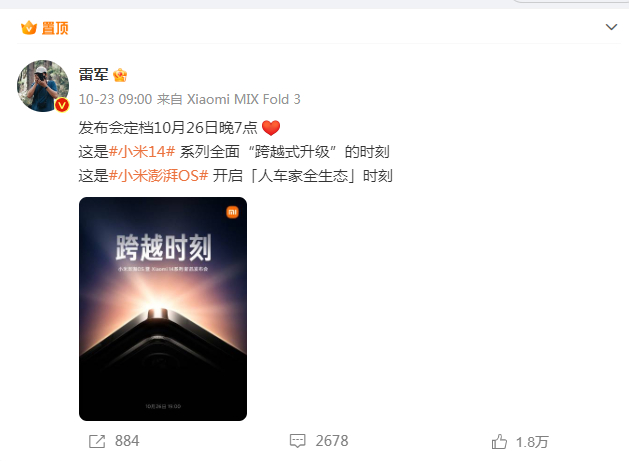 据雷军微博,小米新旗舰14将在北京时间10月26日晚上19点正式发布。