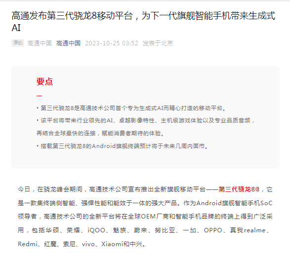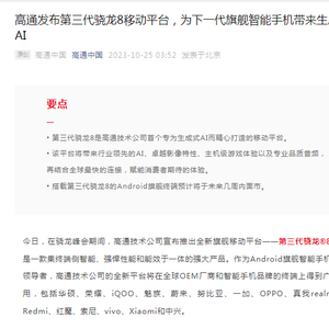 高通重磅发布第三代骁龙8移动平台!小米卢伟冰:小米14系列将全球首发搭载!vivo、iQOO均将发布......