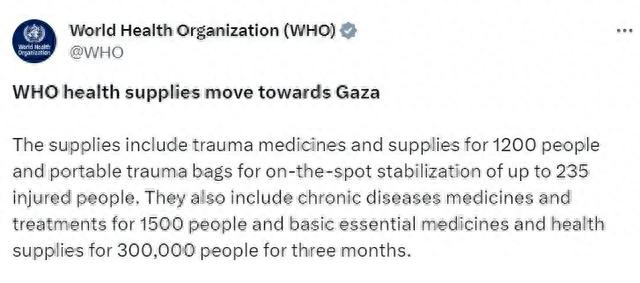 当地时间10月21日,第一批载有国际人道主义救援物资的20辆卡车通过拉法口岸前往加沙,据《以色列时报》报道,这是自10月7日巴以冲突以来首次允许救援物资进入该地区。10月23日,埃及红新月会表示,当天已通过了运往加沙的第三批人道主义救援物资。不过,世界卫生组织10月21日的声明指出,“由于药品和医疗用品短缺和耗尽,加沙境内的医院已经达到了崩溃的边缘……随着敌对行动继续加剧,目前运往加沙的物资几乎无法满足不断升级的卫生需求。”