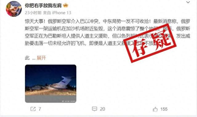 - 网传飞机型号为IL-76,与承载俄罗斯运往加沙的救援物资的飞机型号相同,这可能成为网传说法出处。不过,俄罗斯的这批公开救援物资已经于10月19日全部运抵埃及。