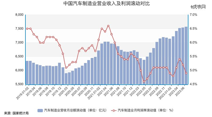 就以2019年至今的国家统计局“汽车制造业”经营状况统计值(经过相应的年化滚动值处理,凸显变化趋势)为例,汽车制造业的营收和利润持续表现为相反的变化趋势。3年时间里(2019年7月和2023年7月对比),营业收入增长了23%,利润仅增长了0.6%,换算而来的利润率下滑了足足23%。