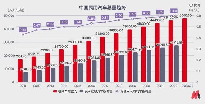 这一趋势,其实可以从很多宏观的统计数据看出。首先是中国民用汽车的保有量增长趋势,截至2022年底,国内机动车驾驶人总数达4.64亿人,对应的民用载客汽车保有量为2.77亿辆。从驾驶人人均汽车拥有量出发,近10年来已经从0.47辆/人,上升到了0.6辆/人。